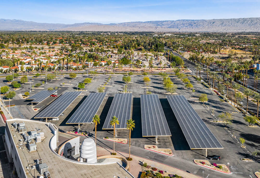 The River Mall at Rancho Mirage solar carport installation represents 667 kilowatts of renewable energy. Solar carports span The River Mall parking lots, protecting cars from the iconic Rancho Mirage sun while meeting 95 percent of the premium shopping center’s common space energy demand. This installation took advantage of the C-PACE program; which partners with commercial facilities in the financing of renewable energy and energy efficiency improvements.